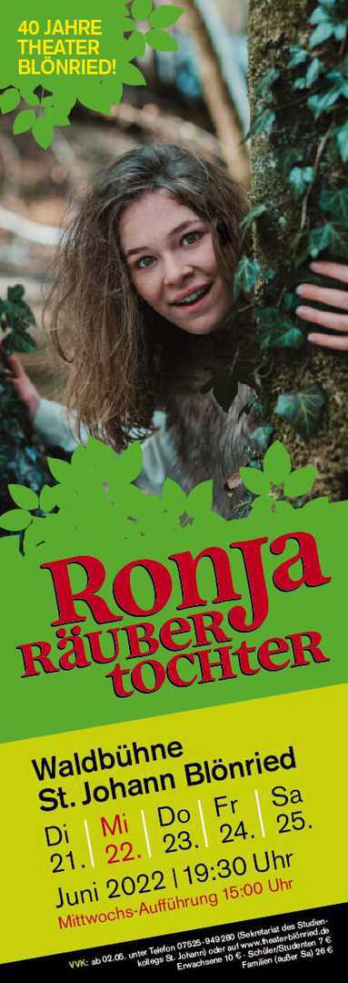 Unsere Theaterfassung des Romans stammt von Thomas Beck. Er hat das Stück im Jahr 2000 hier in Blönried schon einmal zur Aufführung gebracht. Zu unserem 40-jährigen Theaterjubiläum spielten wir das Stück noch einmal, dieses Mal als Freilichtspiel. Thomas Beck hat in seiner Fassung den Schwerpunkt auf die Entwicklung von Ronja und Birk gelegt, weshalb wir gleich mit drei Ronjas spielten: die erste Ronja ist ca. 9 Jahre, die zweite um die 12 und die älteste Ronja 15 Jahre jung. Trotz der ungewöhnlichen Lebenswelt Ronjas lassen sich manche familiären Situationen, die Entwicklungsprobleme von Kindern, bzw. Jungendlichen und vieles, was Menschen von heute berührt, in dieser Fassung entdecken. Vielen Dank auch an Thomas Beck, der zum 40. Jubiläum für sein 30. Theaterstück noch einmal auf den Regiestuhl des Theater Blönried zurückgekehrt ist.